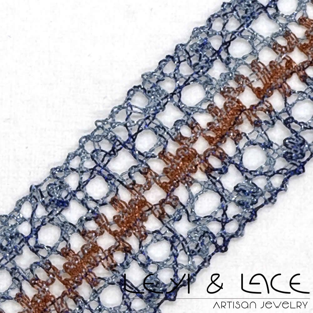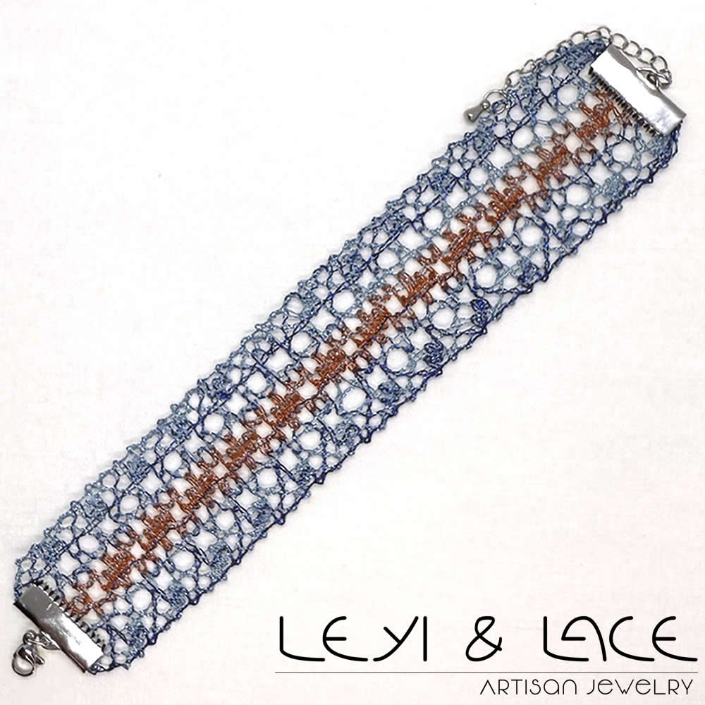 Este brazalete destaca por su encaje de bolillos, confeccionado a mano con hilo metalizado en tonos azules y naranja. La técnica del encaje de bolillos no solo aporta un diseño intrincado y encantador, sino que asegura que cada pieza sea única. La combinación de los colores vibrantes refleja creatividad y sofisticación, haciendo de este accesorio una adición indispensable a tu colección.