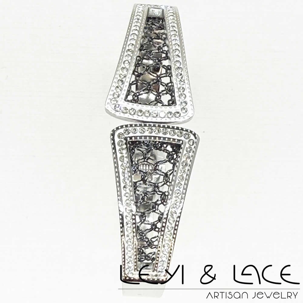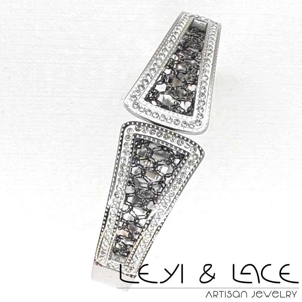 Este impresionante brazalete presenta un delicado Encaje de Bolillos realizado en hilo metalizado, añadiendo un toque artesanal único. Las piedras brillantes que adornan el diseño aportan un brillo que captura todas las miradas, convirtiéndolo en un elemento esencial de tu joyero.