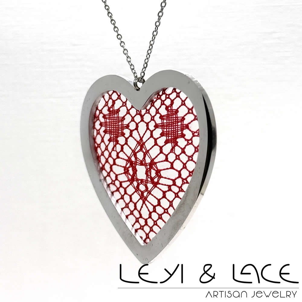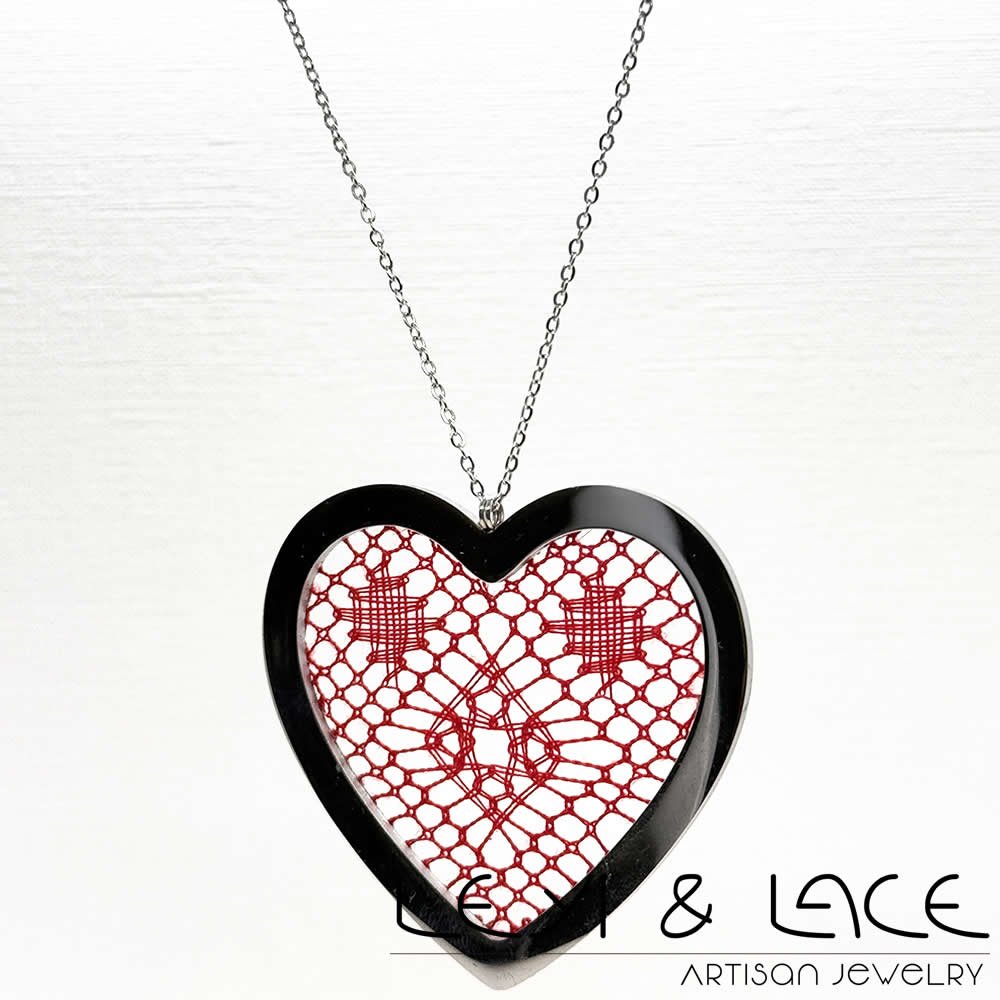 El collar presenta un delicado Encaje de Bolillos realizado en hilo de seda color rojo. Esta combinación de materiales no solo resalta la belleza del collar, sino que también aporta un toque de sofisticación y elegancia.