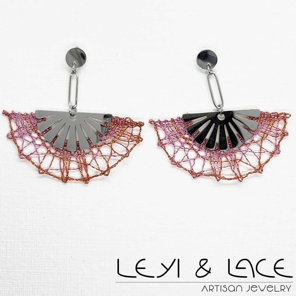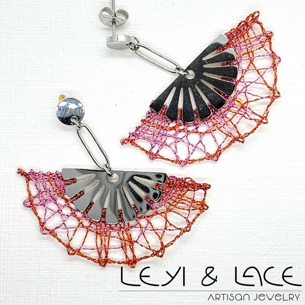 Los pendientes en forma de abanico son una joya que combina elegancia y originalidad. Hechos de acero hipoalergénico, son perfectos para quienes buscan estilo sin sacrificar su comodidad. Cierre Presión. Este diseño exclusivo presenta un delicado Encaje de Bolillos, que se elabora con hilos metalizados en alegres tonos rosa y naranja.