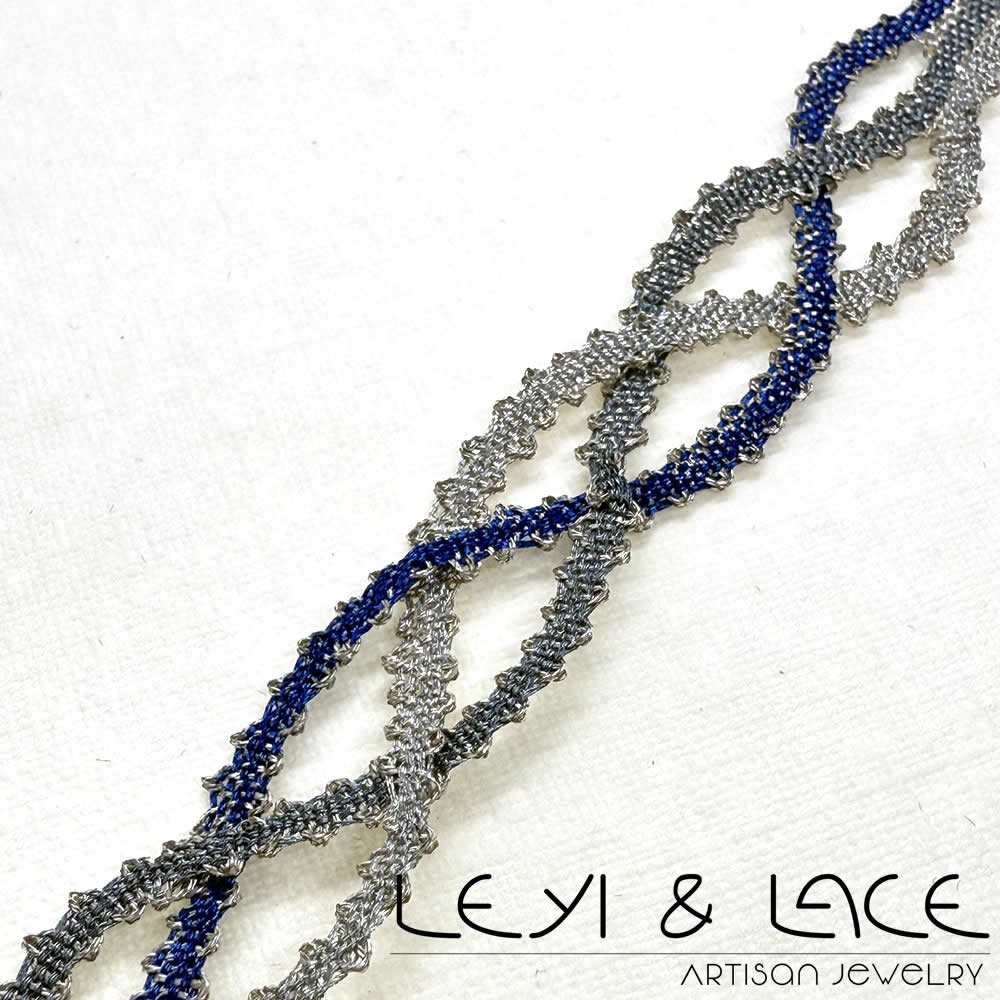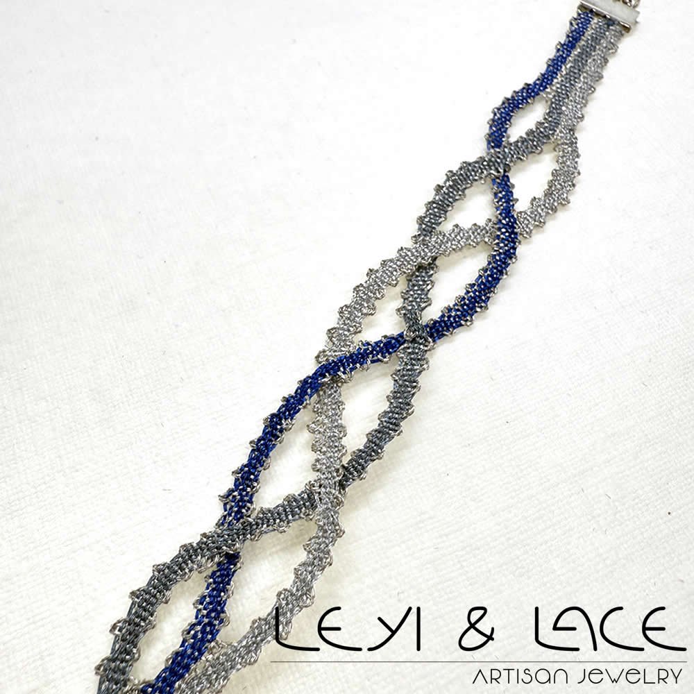 La pulsera enredos es una joya única, diseñada cuidadosamente con Encaje de Bolillos y hilos metalizados en tonos azules y plata. Este diseño contemporáneo se adapta perfectamente a cualquier ocasión, brindando un toque de sofisticación y elegancia a tu estilo diario.