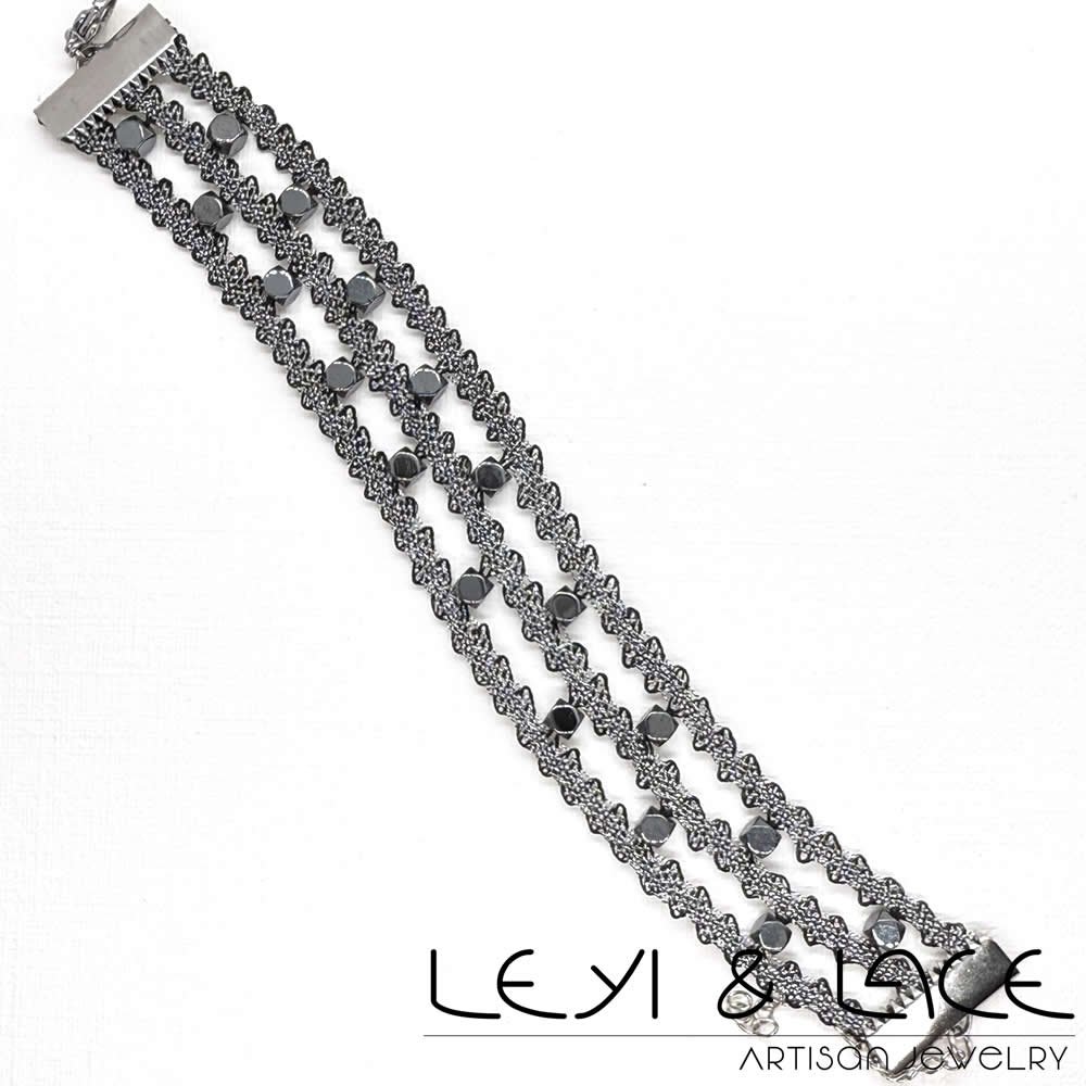 Esta encantadora pulsera Tiras Carbón, realizado en Encaje de Bolillos con hilo metalizado, es la pieza perfecta para realzar cualquier atuendo. Sus delicadas tiras aportan un toque de sofisticación que seguramente capturará todas las miradas.